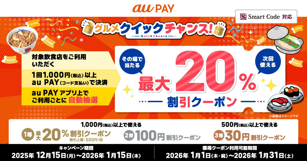 抽選で最大20%割引のクーポンがその場で当たるチャンス!